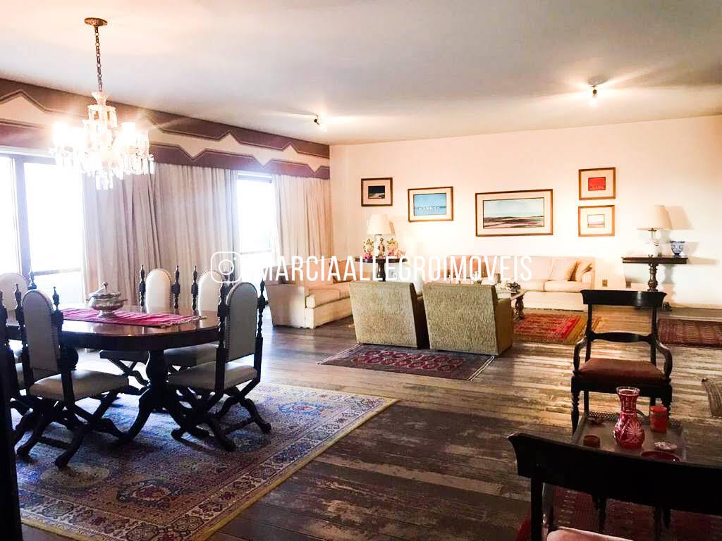 Nascente, super ventilado, 1 apt. por andar,  2 varandas, 3 salas com piso de tabuado , 1 gabinete com acesso privativo com banheiro que pode ser a terceira suíte. Atualmente com 4 quartos sendo 2 suítes com piso de taco de madeira. Apt possui mais 2 banheiros e 1 lavabo, 2 quartos de empregados com 1 banheiro, área de serviço e dispensa, 1 depósito na garagem e 1 sala de motorista com TV.
