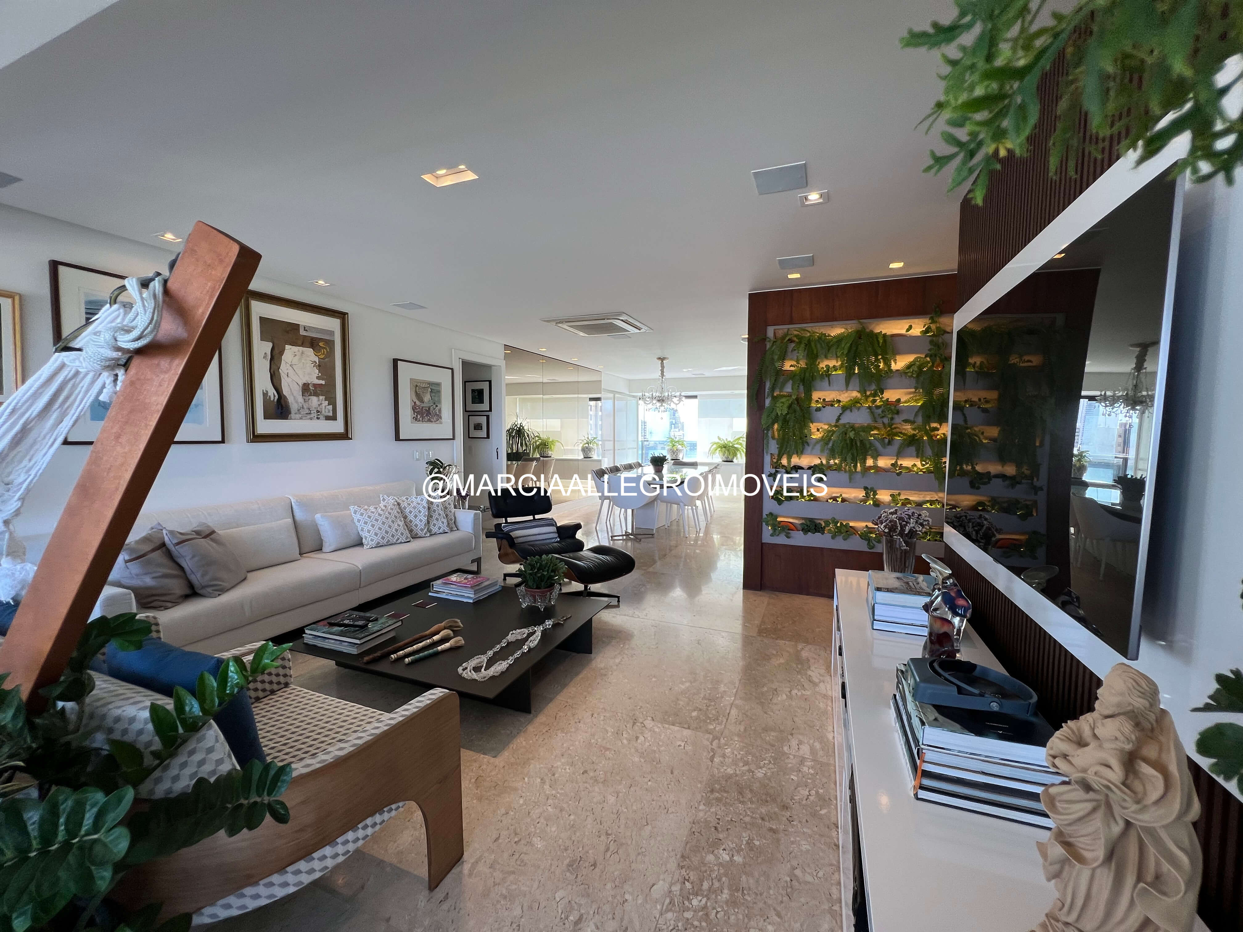 Apt todo climatizado incluindo a sala, ventilação cruzada maravilhosa. Painel de madeira com vegetação natural com iluminação embutida.