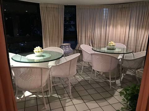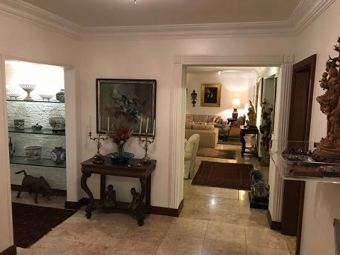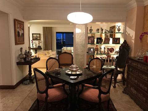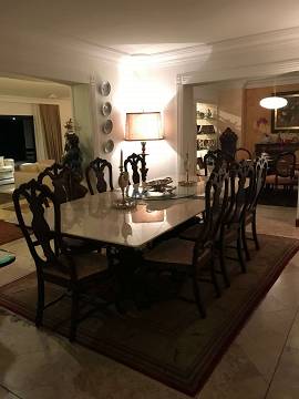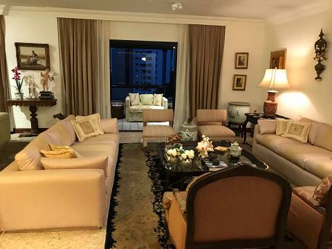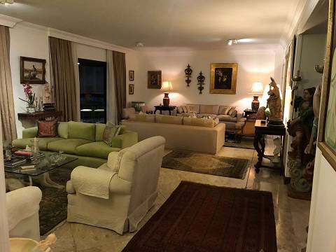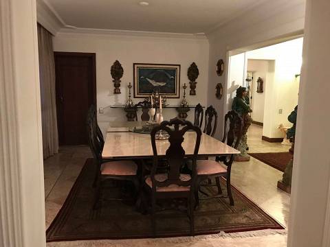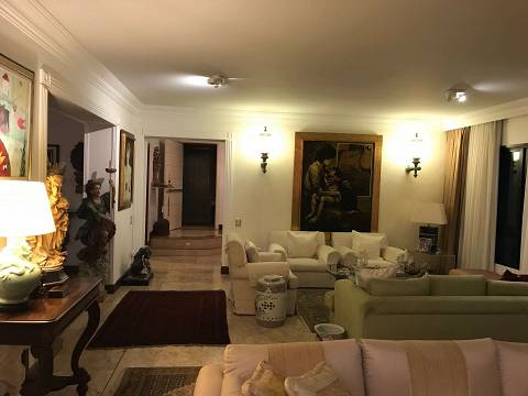 Apartamento super amplo com 400m2 de área privativa, 4 quartos, sendo 3 suítes, suíte master com 2 closets e gabinete, 4 salas (jantar, íntimo, estar e 2 livings), cozinha e área de serviço super amplas e varanda. Piso das salas de mármore bege bahia, piso dos quartos de durafloor. 4 vagas de garagem soltas.