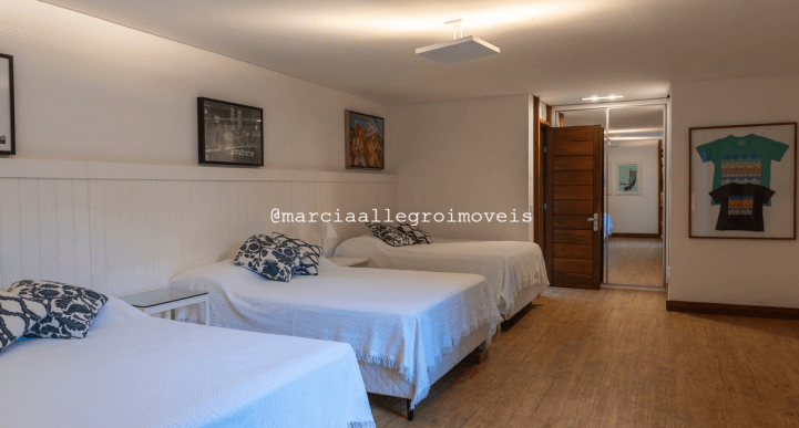 O imóvel possui 5 suítes, sendo 3 no 1 º pavimento com destaque para a mega suíte master com 2 closets e 2 banheiros amplos com Jacuzzi e 2 suítes no térreo, sendo uma suíte externa para hóspedes, com entrada independente, varanda privativa, muito silenciosa, além de ser bem ampla com 3 camas de casal. Todas as suítes e sala íntima possuem piso de madeira cor de mel.
