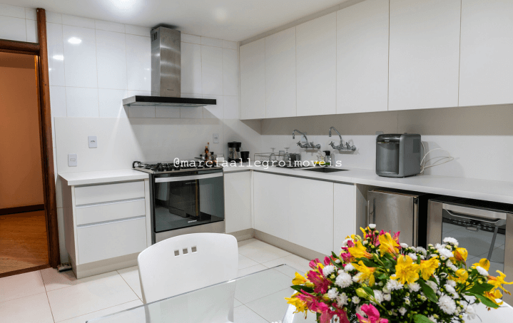 Na parte térrea, o piso de toda a casa é de mármore Travertino Romano, incluindo o lavabo, uma cozinha nova, funcional e equipada e área de serviço interna e externa bastante amplas com depósito e dispensa.